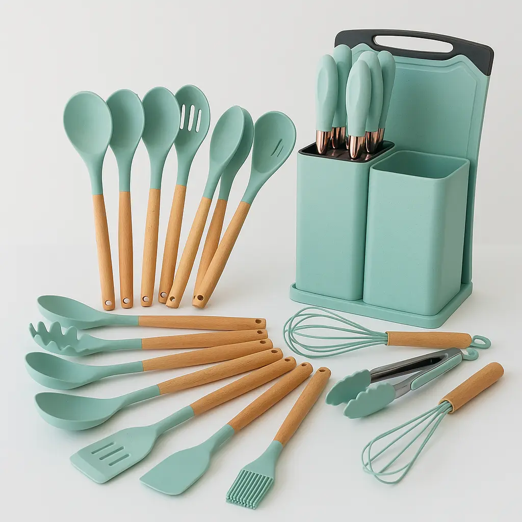 طقم أدوات المطبخ 16 قطعة من السيليكون مع منظم خشبي – أنيق وعصري